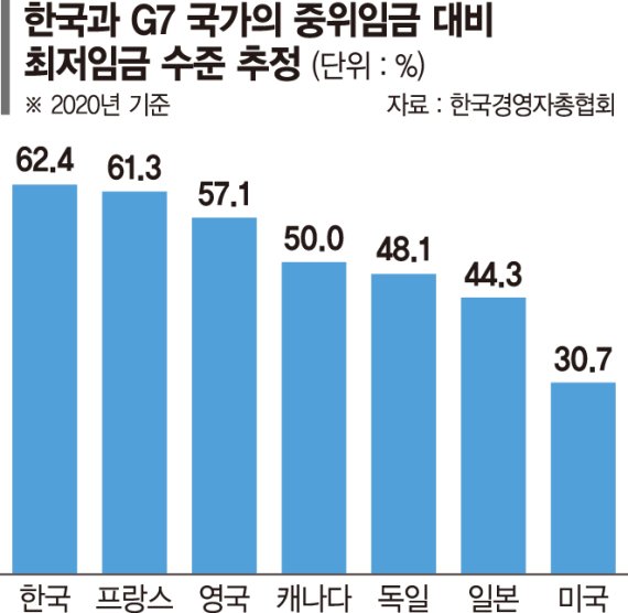 G7 국가의 중위임금 대비 최저임금 수준은 △프랑스 61.3% △영국 57.1% △캐나다 50.0% △독일 48.1% △일본 44.3% △미국 30.7% 등이다.