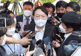 윤석열 전 검찰총장이 9일 열린 서울 남산예장공원 개장식에서 취재진 질문에 답하고 있다. [연합] |