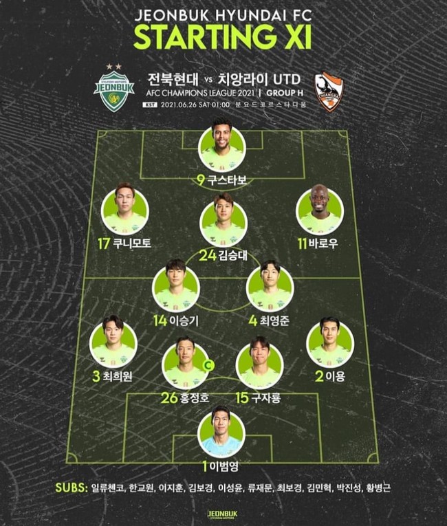 [인터풋볼] 신동훈 기자= 전북현대가 치앙라이와의 일전을 앞두고 선발을 공개했다.