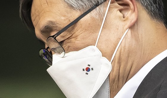 태극기 마스크 착용한 감사원장.. 최재형 감사원장이 25일 오후 서울 종로구 삼청동 감사원에서 나오고 있다. 연합뉴스 |