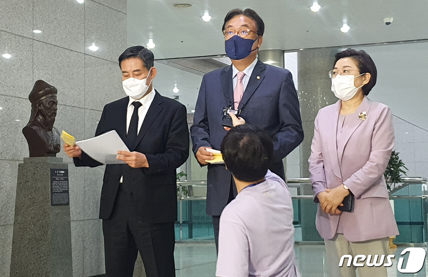 (서울=뉴스1) 김정근 기자 = 군 성범죄 진상규명 및 재발 방지 특별위원회 위원장을 맡고 있는 정진석 국민의힘 의원(가운데)이 28일 오후 서울 용산구 국방부에서 성추행 피해 공군 부사관 사망 사건에 대해 군 관계자들과 면담을 마치고 나와 취재진의 질문에 답하고 있다. 왼쪽부터 신원식, 정진석, 김정재 국민의힘 의원. 2021.6.28/뉴스1