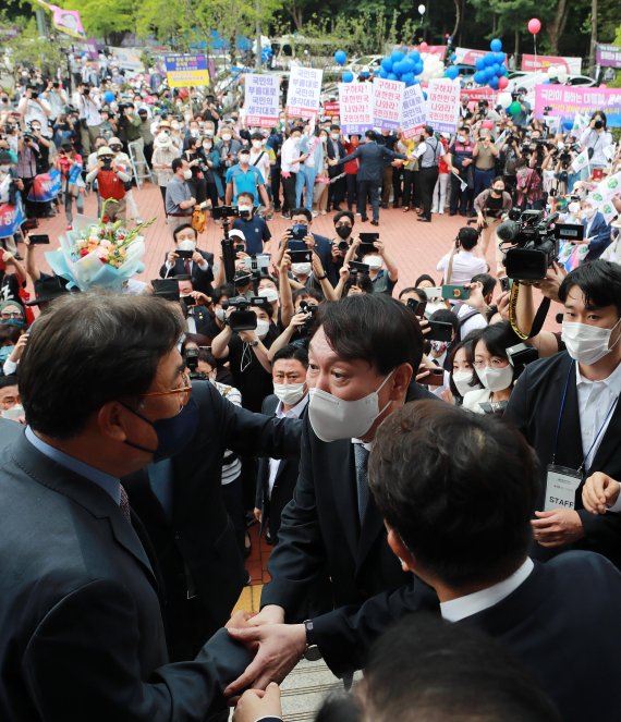 윤석열 전 검찰총장이 29일 오후 서울 서초구 매헌 윤봉길 의사 기념관에서 대선출마선언을 앞두고 국회의원들과 인사하고 있다. 사진=박범준 기자 |