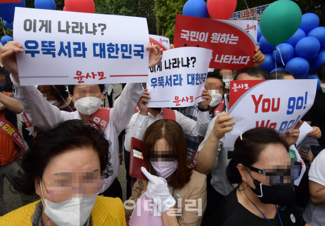 윤석열 전 검찰총장의 대선 출마선언이 예정된 29일 오후 서울 서초구 매헌 윤봉길 의사 기념관에 지지자들이 모여 응원을 하고 있다. 사진=방인권 기자 |