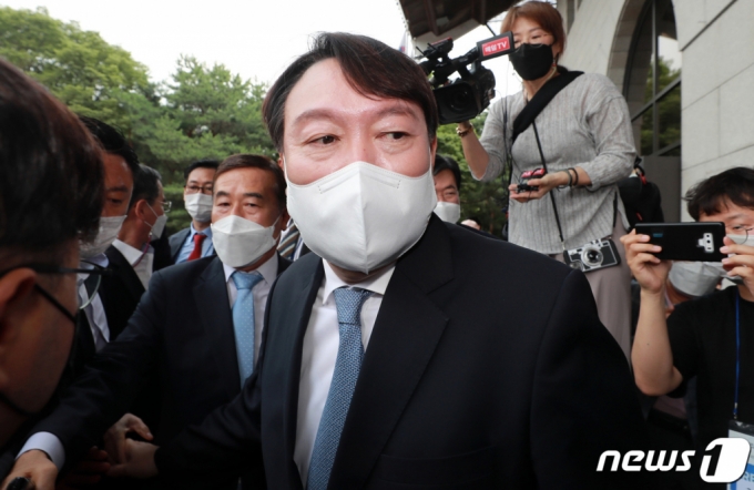 윤석열 전 검찰총장이 29일 오후 서울 서초구 매헌 윤봉길 의사 기념관에서 지지자들에게 인사를 마친 뒤 대선 출마 선언을 하기 위해 이동하고 있다. /사진=뉴스1 |