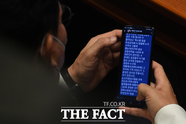 송영길 대표와 대화하는 김용민 의원(사진 위). 이날 본회의장에서 김용민 의원도 윤석열 전 총장의 대선 출마 선언과 관련해 의원실 관계자와 SNS 메시지에 대해 논의를 했다. |