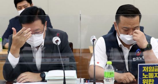 29일 오후 세종시 정부세종청사 최저임금위원회 회의실에서 열린 6차 전원회의에서 사용자위원인 류기정 한국경영자총협회 전무(왼쪽)와 근로자위원인 이동호 한국노동조합총연맹 사무총장이 고민하는 표정을 짓고 있다.(이미지 출처=연합뉴스) |