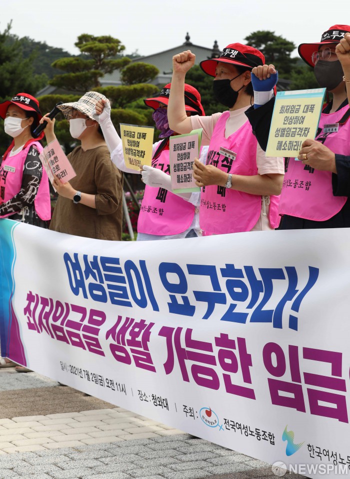 [서울=뉴스핌] 백인혁 기자 = 전국여성노동조합 관계자들이 2일 오전 서울 종로구 청와대 앞 분수대 광장에서 '여성들이 요구한다! 최저임금을 생활가능한 임금으로!' 기자회견을 열고 구호를 외치고 있다. 2021.07.02 dlsgur9757@newspim.com
