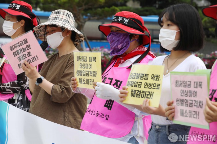 [서울=뉴스핌] 백인혁 기자 = 전국여성노동조합 관계자들이 2일 오전 서울 종로구 청와대 앞 분수대 광장에서 '여성들이 요구한다! 최저임금을 생활가능한 임금으로!' 기자회견을 하고 있다. 2021.07.02 dlsgur9757@newspim.com