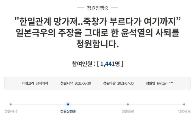 2일 청와대 국민청원게시판에 따르면 지난달 30일 게시된 '"한일관계 망가져..죽창가 부르다가 여기까지" 일본극우의 주장을 그대로 한 윤석열의 사퇴를 청원합니다'라는 제목의 청원이 이날 오후 기준 1441명의 동의를 받았다. 청원은 이달 30일까지 이어진다.