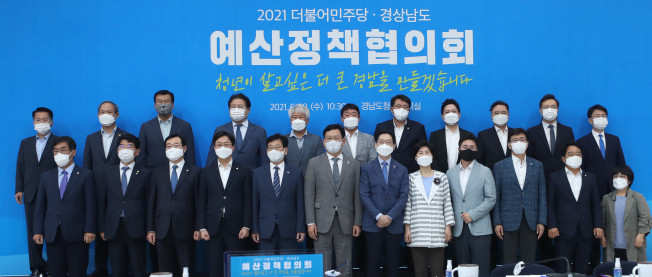 더불어민주당 송영길 대표와 김경수 경남지사 등 참석자들이 6월 30일 오전 경남 창원시 의창구 경남도청 대회의실에서 열린 '더불어민주당-경남도, 예산정책협의회'에서 기념 촬영하고 있다. 이 자리에서 송 대표는 "한진해운에 4000억 원만 투입됐으면 그 때 살릴 수 있던 것을 오로지 청산가치, 잔존가치의 금전적 비교만 하고 산업에 대한 이해가 없는 기재부와 금융관료들이 파산 처분시켰다"고 밝혔다. 송 대표는 유일호 전 경제부총리로부터 이러한 내용을 들었다고 전했다.(연합뉴스) |