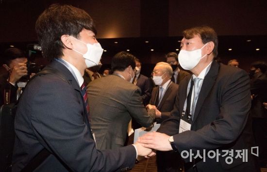 이준석 국민의힘 대표와 윤석열 전 검찰총장이 30일 서울 중구 신라호텔에서 열린 한 행사에 참석, 인사를 나누고 있다./국회사진기자단 |