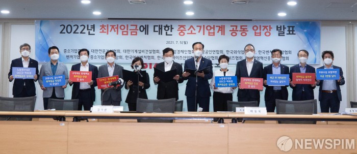 [서울=뉴스핌] 윤창빈 기자 = 김기문 중소기업중앙회 회장(왼쪽 여섯번째부터), 배동욱 소상공인연합회 회장과 중소기업계 회장단들이 5일 오전 서울 여의도 중소기업중앙회에서 열린 '2022년 최저임금에 대한 중소기업계 공동 입장 발표' 기자회견에서 성명서 낭독을 하고있다. 2021.07.05 photo@newspim.com