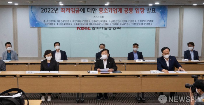 [서울=뉴스핌] 윤창빈 기자 = 김기문 중소기업중앙회 회장이 5일 오전 서울 여의도 중소기업중앙회에서 열린 '2022년 최저임금에 대한 중소기업계 공동 입장 발표' 기자회견에서 인사말을 하고 있다. 2021.07.05 photo@newspim.com