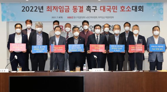 8일 오후 서울 여의도 중소기업중앙회에서 열린 2022년 최저임금 동결 촉구 대국민 호소대회에서 주보원 중기중앙회 노동인력위원장(앞줄 오른쪽 네번째)과 22개 업종별 대표자들이 피켓을 들고 포즈를 취하고 있다. 중소기업중앙회는 이 자리에서 코로나 피해 여파와 인건비 부담 심화, 폐업 증가 등의 현장 애로사항을 호소하며 내년도 최저임금 동결을 촉구했다.뉴스1 제공. |