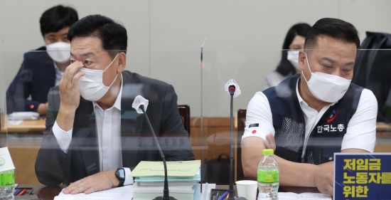 8일 오후 정부세종청사 최저임금위원회 회의실에서 열린 내년도 최저임금 8차 전원회의에서 사용자위원인 류기정 한국경영자총협회 전무(왼쪽)와 근로자위원인 이동호 한국노동자총연맹(한국노총) 사무총장이 고민하는 모습.(이미지 출처=연합뉴스) |