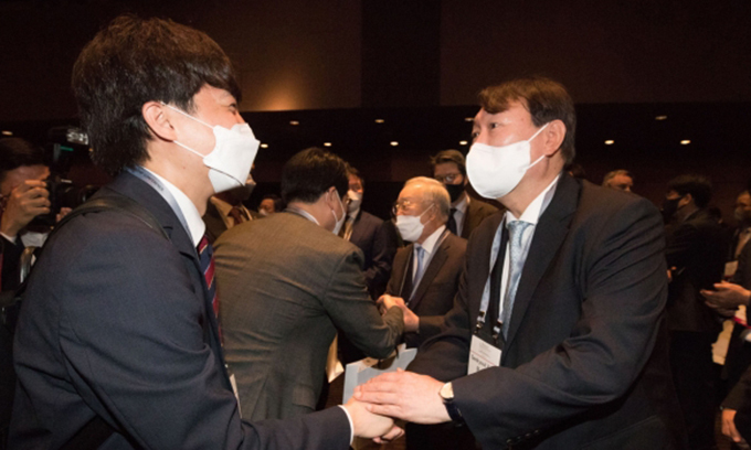 이준석 국민의힘 대표와 윤석열 전 검찰총장이 지난달 30일 오전 서울 중구 신라호텔에서 개막한 아시안리더십콘퍼런스 개회식에 참석해 악수를 나누고 있다. 뉴스1 |