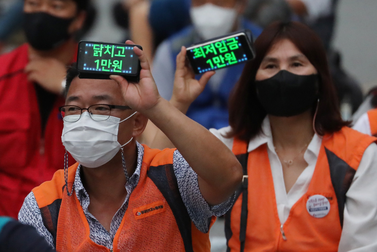 민주노총이 12일 오후 최저임금위원회 전원회의가 진행 중인 세종시 정부세종청사 고용노동부 앞에서 최저임금 인상을 촉구하는 투쟁문화제를 열고 있다. [연합] |