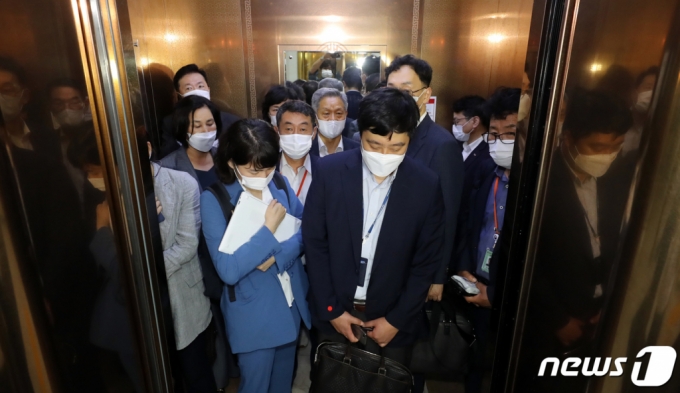 (세종=뉴스1) 장수영 기자 = 최저임금위원회 사용자위원들이 12일 정부세종청사 고용노동부 내 최저임금위원회 전원회의장에서 열린 제9차 전원회의에서 공익위원의 안에 반발하며 전원 퇴장하고 있다. 이날 최저임금위원회 제9차 전원회의에서 최임위는 내년도 최저임금을 올해보다 5.045% 인상된 9160원으로 의결했다. 2021.7.12/뉴스1 |