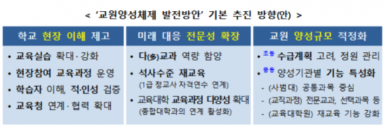 아울러 중등 교원 중 국어와 영어, 수학, 사회계열, 과학계열 등 공통과목은 사범대 중심으로 양성한다. 전문·선택과목이나 신규분야 교원 양성은 일반학과 교직이수과정을 중심으로 양성하기로 했다. 교육대학원은 1급 정교사 자격 연수 등 현직교사 재교육 중심으로 역할을 조정한다.