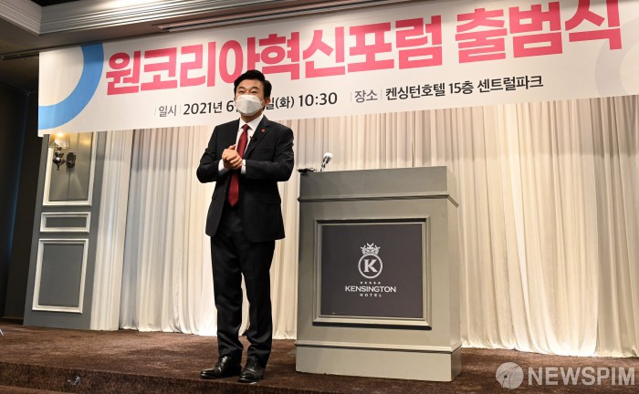 [서울=뉴스핌] 최상수 기자 = 지난달 22일 서울 여의도 켄싱턴호텔에서 열린 원코리아 혁신포럼 출범식에서 원희룡 제주도지사가 강연을 하고 있다. 2021.06.22 kilroy023@newspim.com |