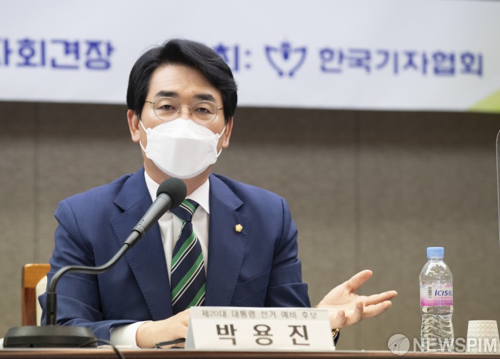 [서울=뉴스핌] 국회사진취재단 = 한국기자협회 주최 제20대 대통령 예비후보 더불어민주당 박용진 의원 초청 왁자지껄 토론회가 13일 오후 서울 중구 한국프레스센터 19층 기자회견장에서 열렸다. 박용진 예비 후보가 질문에 답하고 있다. 2021.07.13 photo@newspim.com |