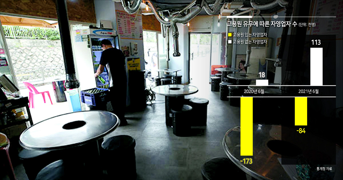 14일 통계청이 발표한 6월 고용동향에 따르면 고용원 없는 자영업자는 전년동월대비 11만 3000명 증가했다. 지난해 6월 1만 8000명 늘어났음에도 증가세를 이어갔다. ‘나홀로 사장님’이 늘어나고 있는 것이다. 반면, 고용원 있는 자영업자는 8만 4000명 줄었다. 지난해 같은달 17만 3000명이 준 기저효과가 있었지만 또다시 큰폭으로 줄었다.