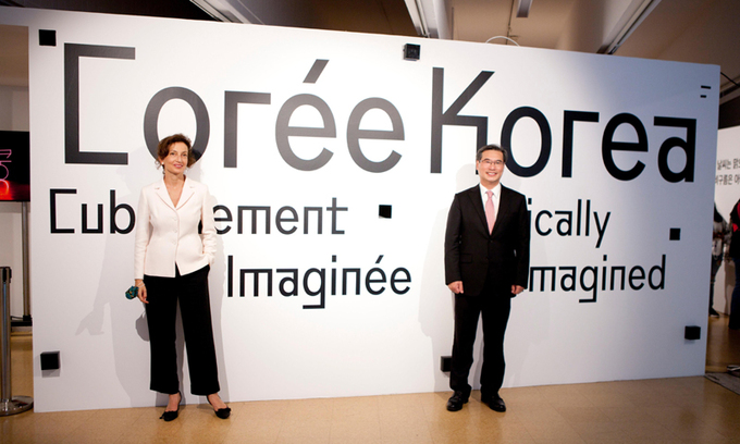 오드레 아줄레(왼쪽) 유네스코 사무총장과 김동기 유네스코 한국대표부 대사가 13일(현지시간) 유네스코 본부 ‘한국: 입체적 상상’ 전시장에서 기념촬영을 하고 있다. 주프랑스 한국문화원 제공 |