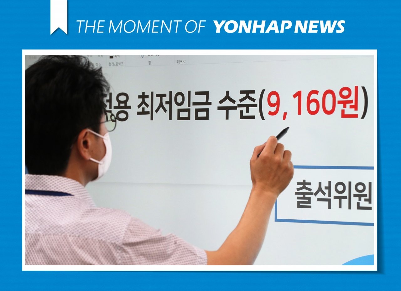 내년도 시간당 최저임금이 올해보다 5.1% 오른 시간당 9160원으로 결정된 지난 13일 오전 세종시 정부세종청사 전원회의실에서 관계자가 모니터 앞에서 자료를 살피고 있다. [연합] |