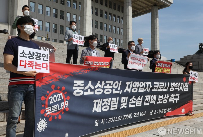 [서울=뉴스핌] 이형석 기자 = 20일 오전 서울 여의도 국회에서 하태경, 최승재 국민의힘 의원등이 참석한 가운데 '중소상공인·자영업자, 코로나 방역지침 재정립 및 손실전액보상 촉구 기자회견'이 열리고 있다. 2021.07.20 leehs@newspim.com