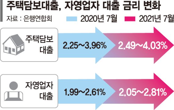 개인사업자(자영업자) 대출 금리도 상승했다. KB국민, 신한, 하나, 우리, NH농협은행에 따르면 올해 7월 자영업자 보증서담보 기준 대출 금리는 2.05~2.81%였다. 지난해 7월에는 1.99~2.61%였던 것을 감안하면 소폭 상승한 셈이다. 특히 각 은행이 자영업자에게 주는 우대금리가 상승했음에도 불구하고 가산금리가 인상되면서 금리가 올랐다. 시중은행 관계자는 "가산금리는 연체율이나 업종 신용평가 등으로 이뤄지는데 코로나19로 업종 등급이 하락하면서 가산금리 등이 일부 상승했다"고 전했다.