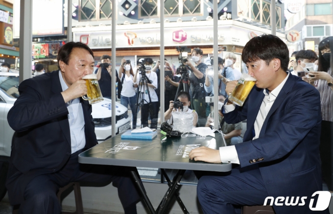 이준석 국민의힘 대표와 윤석열 전 검찰총장이 25일 오후 서울 광진구의 한 음식점에서 '치맥회동'을 하고 있다. 2021.7.25/뉴스1 |