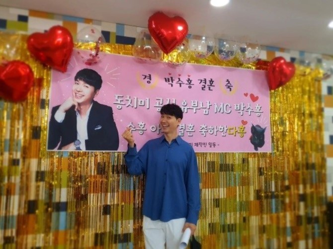 공개된 사진에는 결혼 축하 플랜카드 앞에서 밝은 미소를 짓고 있는 박수홍의 모습이 담겼다. 코미디언 선후배 사이인 두 사람의 돈독한 우정이 훈훈함을 자아낸다.
