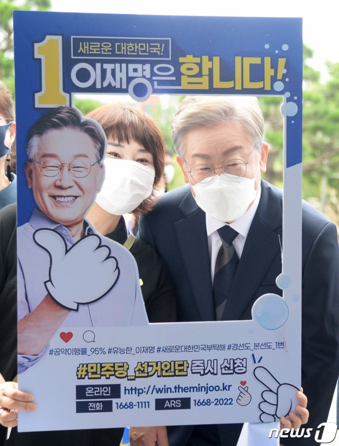 이재명 경기도지사가 지난 1일 전북 전주시 전북도의회에서 열린 기자간담회에 앞서 지지자들과 기념촬영을 하고 있다. 2021.8.1/사진=뉴스1 |