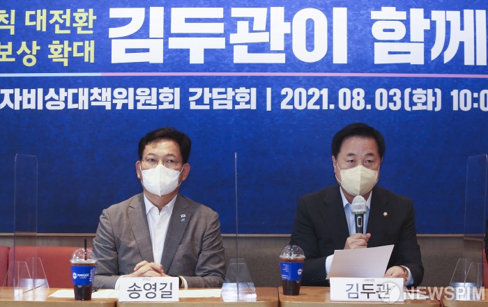 [서울=뉴스핌] 국회사진취재단 = 대선 경선 후보인 김두관 더불어민주당 의원이 3일 서울 마포구 한 커피전문점에서 열린 전국 자영업자 비상대책위원회 간담회에서 발언을 하고 있다. 2021.08.03 photo@newspim.com