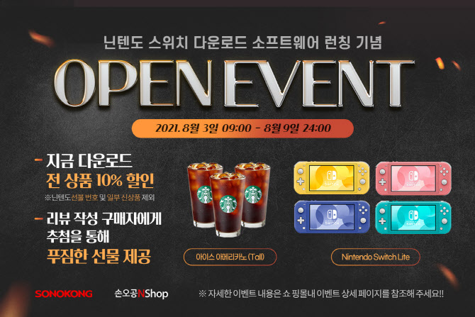 손오공은 닌텐도 스위치 다운로드 소프트웨어 상품 론칭을 맞아 할인 혜택과 함께 경품 리뷰 이벤트도 진행한다. 오는 9일까지 일주일간 닌텐도 스위치 다운로드 소프트웨어 전 상품을 10% 할인된 가격에 판매한다. 다운로드 소프트웨어 상품 리뷰를 작성한 구매자 중 총 104명을 추첨해 닌텐도 스위치 라이트(4명)와 아이스 아메리카노 교환권(100명)을 증정한다.