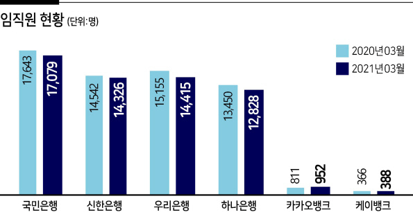 인뱅과 달리 시중은행들은 대출이자를 더 낮출 비용절감의 여지가 제한적이다. 올해 3월 기준 KB국민은행의 전체 임직원은 1만 7079명이고, 우리은행 1만4415명, 신한은행 1만4326명, 하나은행 1만2828명으로 4대 은행 모두 1만명 넘는 인력을 보유 중이다. 영업수익 가운데 인건비 비중은 30~35%에 달한다. 연간 순이익과 맞먹는 기업이다. 이승환 기자