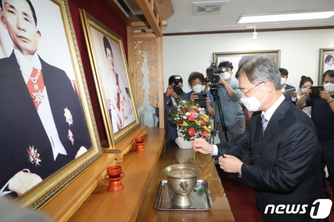 국민의힘 대권 주자인 최재형 전 감사원장이 6일 경북 구미시 박정희 전 대통령 생가를 방문해 박 전 대통령 내외 영전에 분향하고 있다. /사진=뉴스1 |