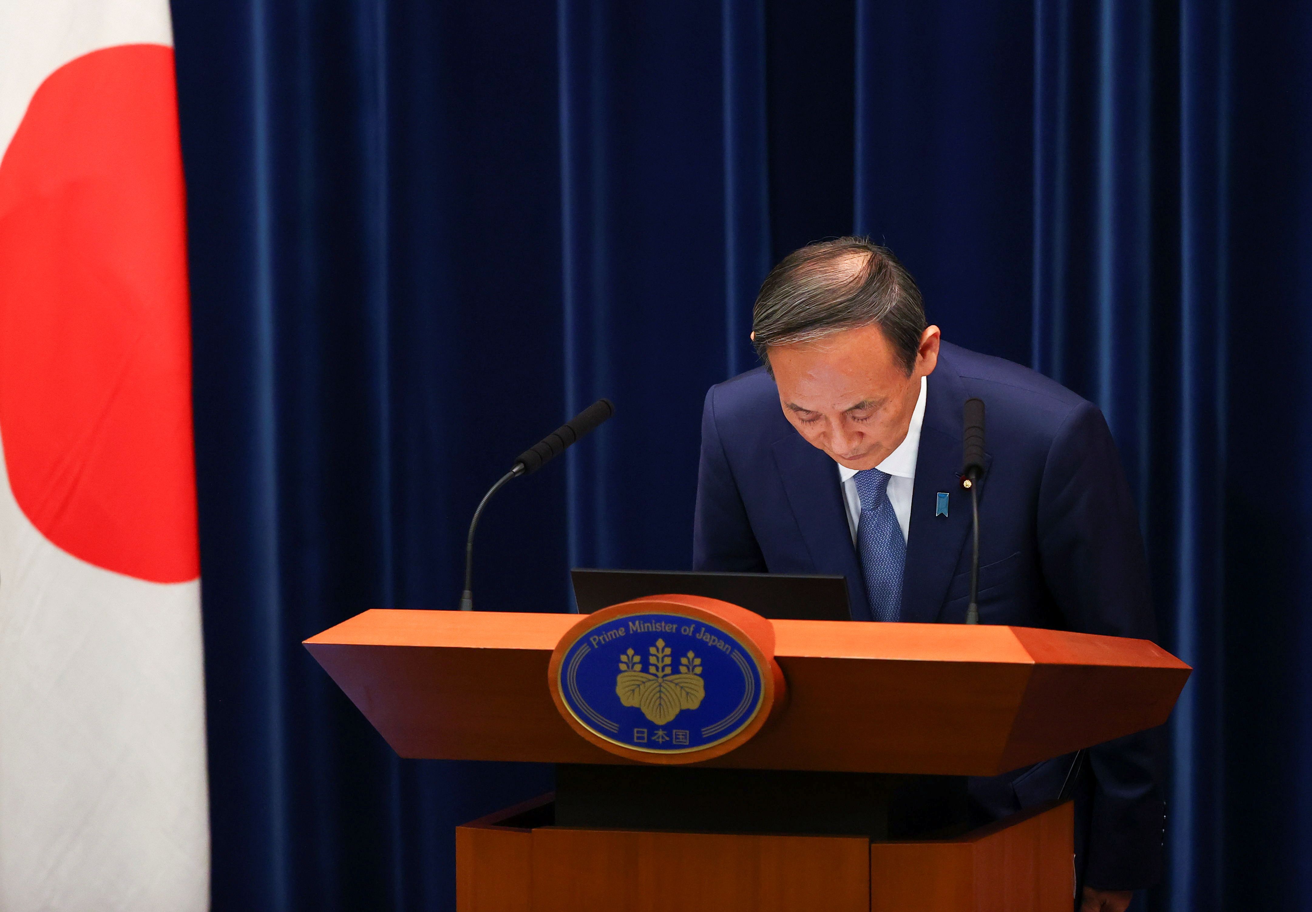 스가 요시히데 일본 총리가 지난 7월 30일 수도 도쿄의 총리관저에서 신종 코로나바이러스 감염증(코로나19) 확대 관련 기자회견을 하면서 고개를 숙이고 있다. /로이터 연합뉴스 |