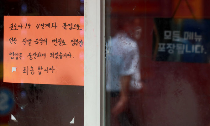 지난 5일 서울 중구 명동 거리의 한 식당에 신종 코로나바이러스 감염증(코로나19) 거리두기 4단계와 폭염으로 인해 휴업을 알리는 안내문이 부착돼 있다. (사진=연합뉴스) |