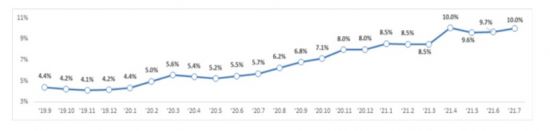 가계대출 증가율은 작년 11월부터 올해 3월까지 5개월간 8∼8.5% 범위에서 움직이다가 4월부터 7월까지 4개월간은 9.6∼10%의 높은 수준에서 오르내리고 있다. 업계에서는 금리인상 위기감에도 불구하고 부동산 가격통제 실패로 주택담보대출 증가폭이 확대된 데다 카카오뱅크 등 공모주 청약 열기로 마통을 포함한 신용대출이 크게 늘어난 것을 주 원인으로 꼽고 있다.