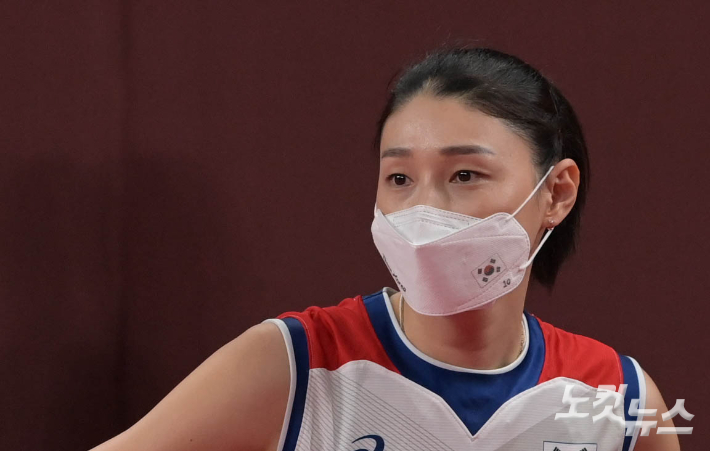 김연경이 8일 도쿄 고토시 아리아케아리나에서 열린 2020도쿄올림픽 여자 배구 세르비아와의 동메달 결정전에서 패한 후 눈시울을 붉히고 있다. 이한형 기자 |