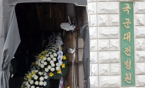 성폭력 피해 신고 후 사망한 해군 여성 중사의 빈소가 마련된 대전 유성구 국군대전병원에 13일 화환을 실은 화물차가 들어가고 있다. 대전=연합뉴스 |