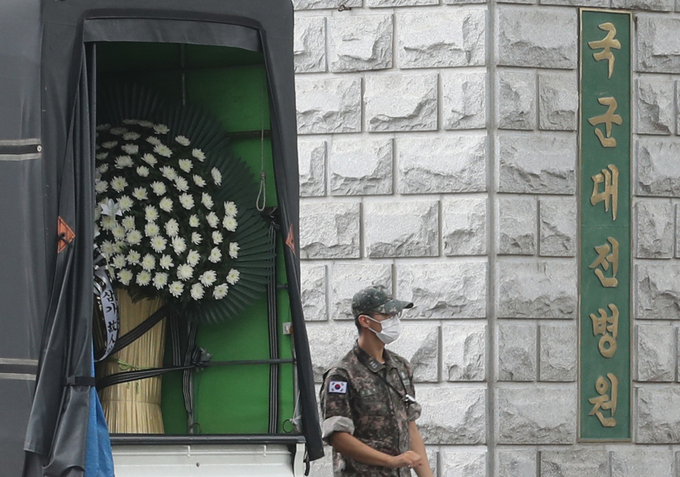 마스크를 착용한 병사가 14일 해군 성추행 사망사건 피해 여중사의 빈소가 마련된 국군대전병원 정문에서 전방을 주시하는 가운데 조화를 실은 화물차가 멈춰 서 있다. 대전=연합뉴스 |