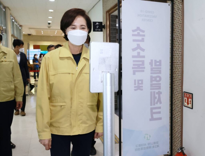 유은혜 사회부총리 겸 교육부 장관이 12일 서울 서대문구 코로나19 예방접종센터를 찾아 발열확인을 하고 있다. /사진제공=교육부 |