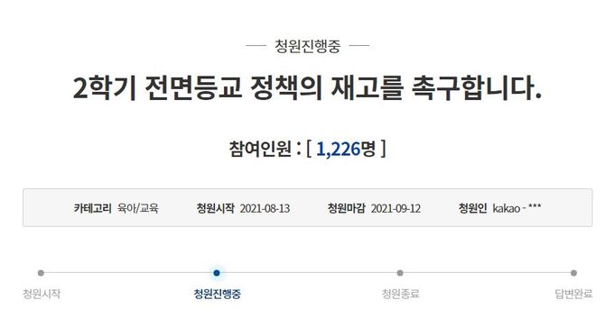 지난 13일 청와대 국민청원 게시판에 ‘2학기 전면등교 정책의 재고를 촉구합니다’라는 제목의 글이 올라왔다.