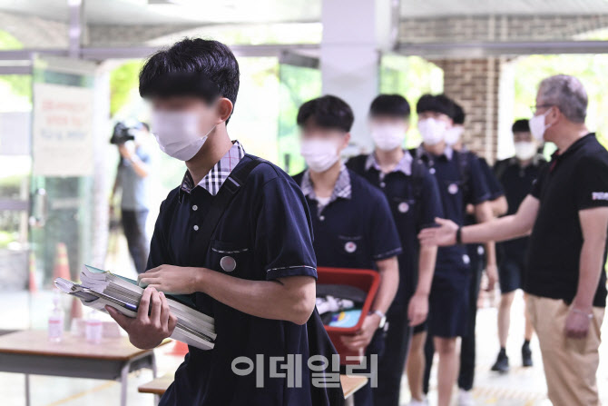 일선 학교의 2학기 개학이 본격적으로 시작되는 17일 서울 시내 한 고등학교에서 2~3학년 학생들이 등교하고 있다. 학생들은 교정에 들어서며 손소독과 체온 측정을 하고 각자의 교실로 들어갔다.(사진=공동취재단) |