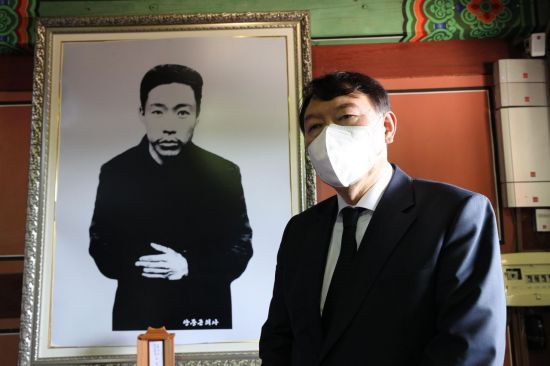 윤석열 국민의힘 대선 예비후보가 광복절인 지난 15일 오전 서울 용산구 효창공원 내 독립운동가 7위 영정을 모신 의열사를 찾아 안중근 의사에 대한 설명을 듣고 있다. [이미지출처=연합뉴스] |