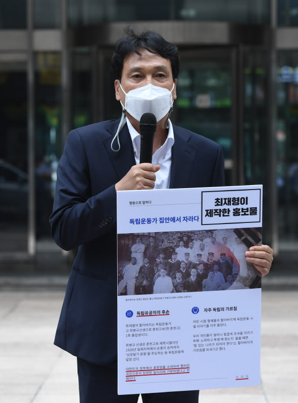 안민석 더불어민주당 의원이 지난 13일 서울 여의도 국민의힘 대선주자인 최재형 전 감사원장 선거 캠프 앞에서 최 전 원장에게 친일 의혹에 대한 직접 해명을 요구하고 있다. (사진=국회사진기자단) |