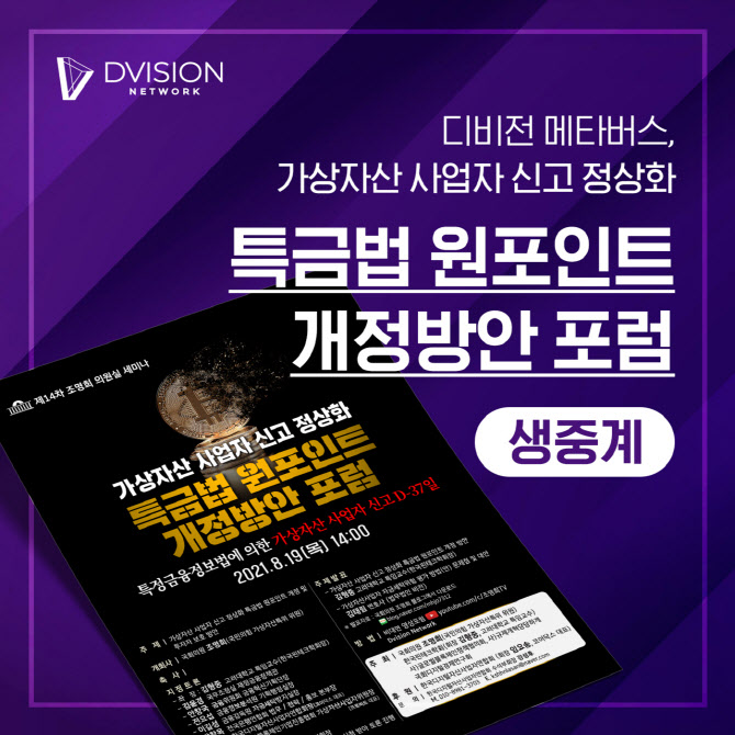 대체불가토큰(NFT) 기반의 메타버스 플랫폼, 디비전 네트워크(Dvision Network)가 오늘(19일) 자사의 메타버스에서 <가상자산 사업자 신고 정상화 특금법 원포인트 개정방안> 웹포럼을 온라인으로 생중계한다.