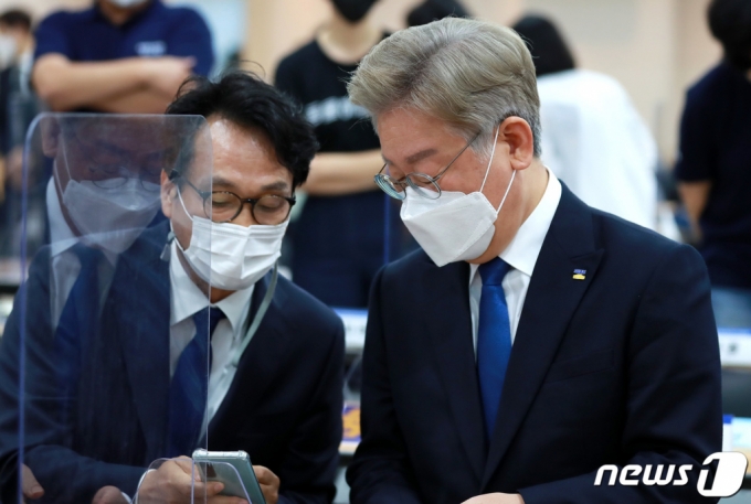 (서울=뉴스1) 구윤성 기자 = 더불어민주당 대권주자인 이재명 경기도지사(오른쪽)가 22일 서울 영등포구 이룸센터에서 열린 '개식용 및 반려동물 매매 관련 제도개선 국회 토론회'에 참석해 안민석 의원과 대화하고 있다. 2021.6.22/뉴스1 |